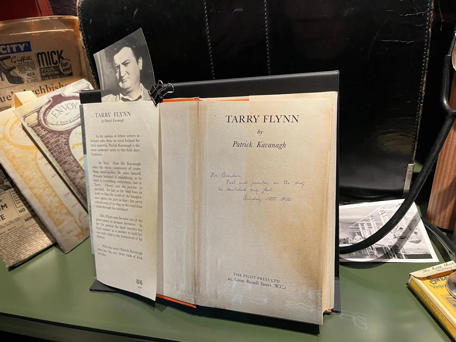 The inscription Patrick Kavanagh wrote to Behan in the flyleaf of Tarry Flynn as displayed at The Patrick Kavanagh Centre.